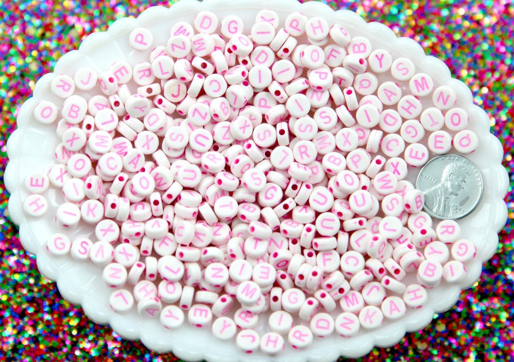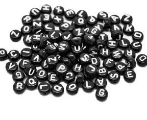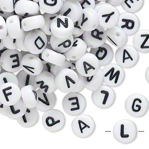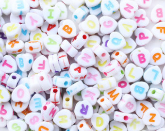 Choice of white round beads with black letters, black round beads with white letters, or white heart beads with various rainbow colours. With these you can have all one color letters, alternating, or rainbow, but some letters or colors from this last option will be low in stock so you may want to check with me before purchasing to be sure that I have your letters available.