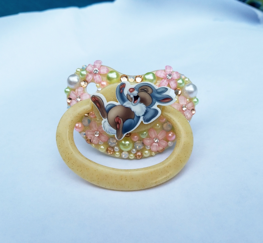 Decorated gold shimmer adult pacifier with pink, green, and white pearls snd rhinestomes, link gemstome flower cabochons, and a bunny cabochon!! It has a baby pants adult sized nipple ((nuk 6 equivalent)).