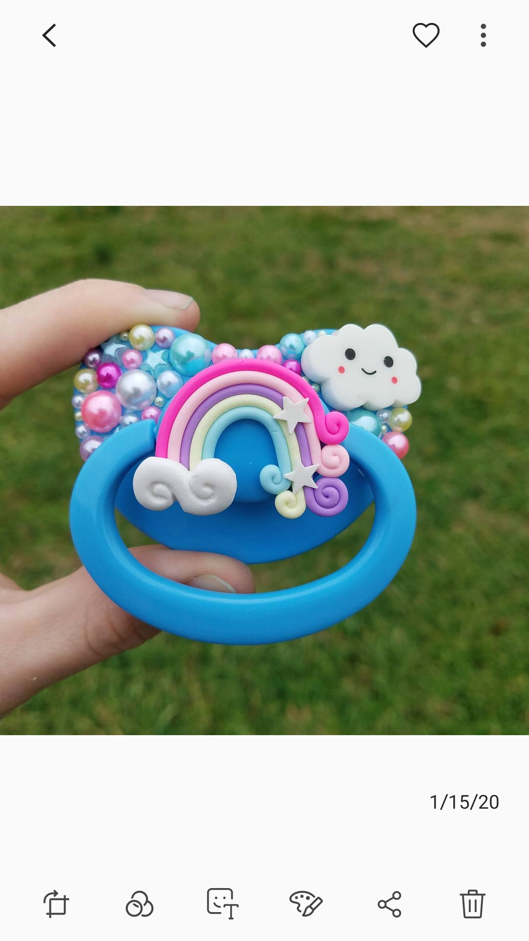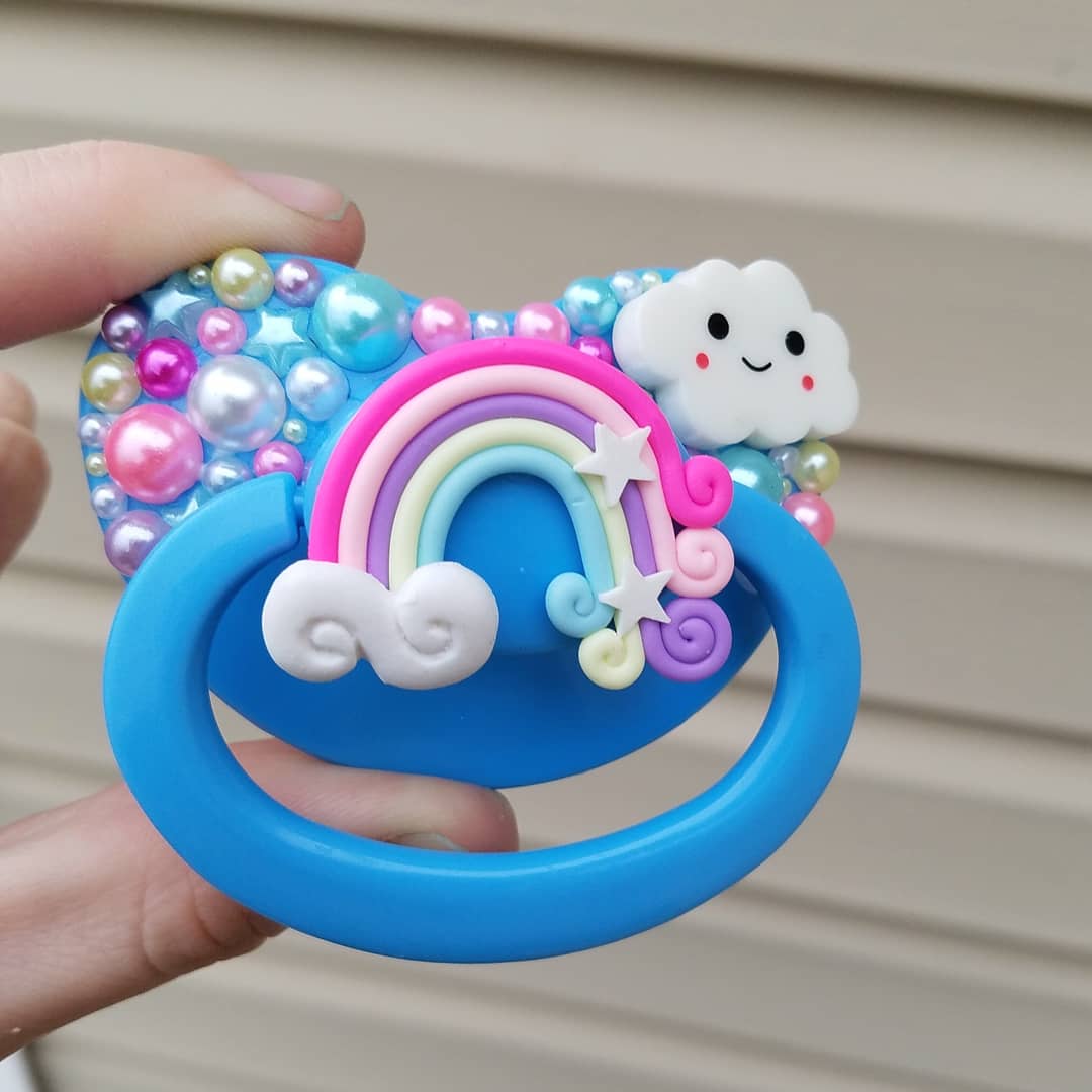 Wash the nipple with warm soapy water before use. I do not recommend getting the rest of the paci wet. Please be careful to keep your paci from extreme temperatures! During the winter, let cold package warm up before handling your paci. In the summer, be sure to watch for your delivery because while I seal and try to protect the paci with the packaging when I ship, packages left on hot doorsteps long enough may eventually cause the glue to soften or the decorations to become misplaced.